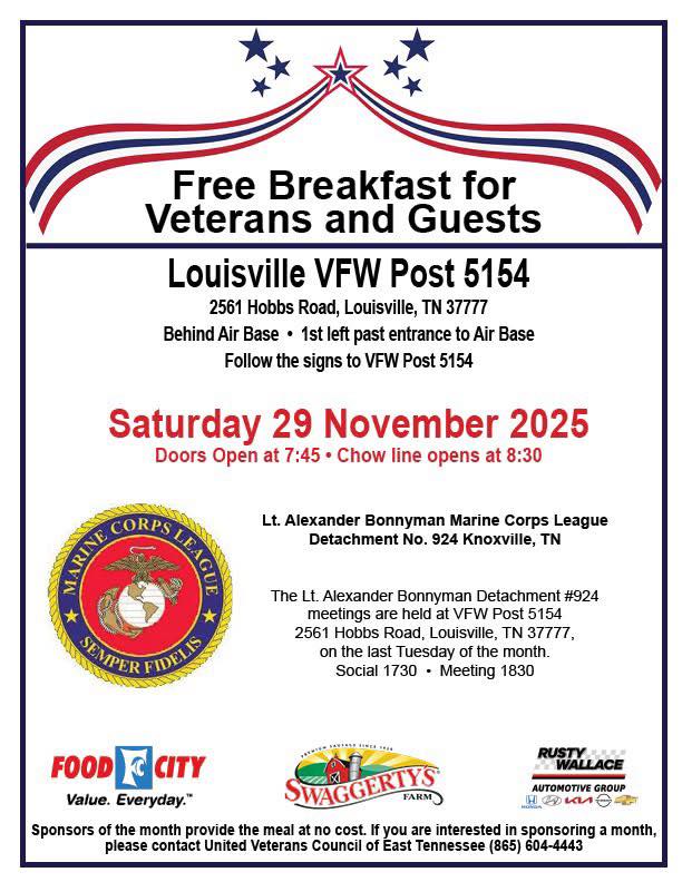 Lt. Alexander Bonnyman Detachment will be sponsoring the Veteran Breakfast at the VFW Post 5154.