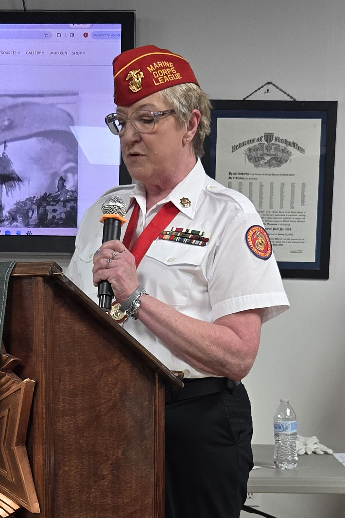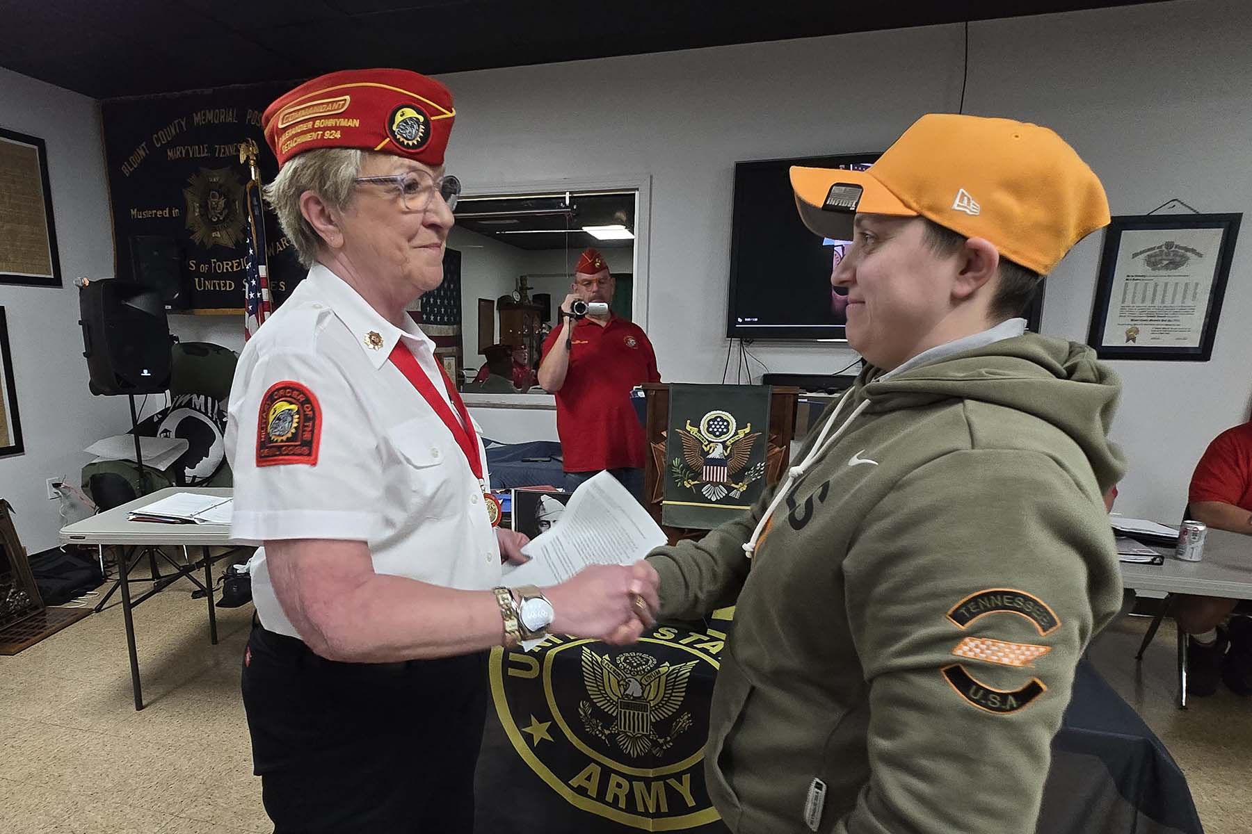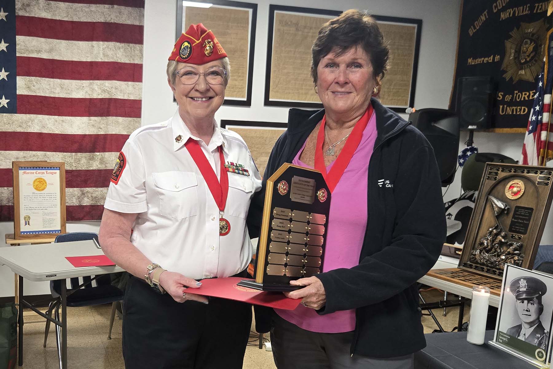 - Commandant Susie Schmidt getting ready to award some beautiful flag cases
